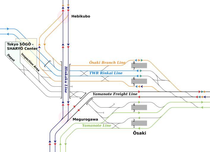 Keywords: Rail Tracks map Osaki Station.svg JR-East and TWR Ōsaki Station in Shinagawa Tokyo <br />Reference material Japan Railfan Magazine Tetsudō Fan Japanese Vol 44-1 No 513 2004-01 KOYUSHA CO LTD 21p 京都品 区にあるJR 日 ・ 京臨海高 鉄道 大崎駅付近の配線略図<br /> 参 文献: 特集 短絡線ミステリー7 鉄道ファン 第44巻1号 巻第513号 2004年1 号 交友社 2004 21頁 凡例は駅配線図テンプレートを参照 Plan des voies de gare d'Ōsaki <br />Plan de voies Created with Text Editor Tawashi2006 created from icons in Category Rail_tracks_map_template 2009-07-25 Tawashi2006 with http //kiritachinoboru tripod com/pdv2svg_en html pdv2svg Tawashi2006 validSVG translation possible Rail track diagrams of JR East train stations Ōsaki Station |