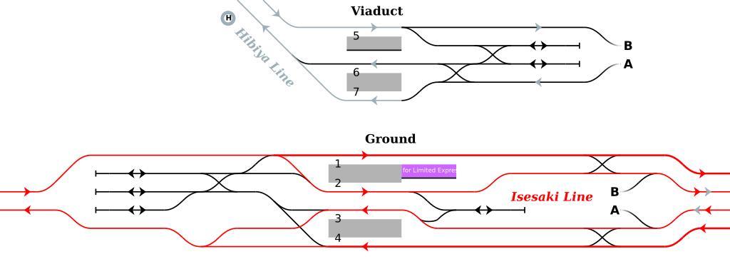 Keywords: Rail Tracks map Tobu and Metro Kita-Senju Station.svg Tobu Railway Tokyo Metro Kita-Senju Station in Adachi Tokyo Japan <br /> Reference material <br /> DENKISHA KENKYUKAI THE RAILWAY PICTORIAL Tetsudō Pictorial Japanese magazine Vol 58-1 No 799 Extra edition - 武鉄道 Tobu Railway insert page at end 2008-01 <br /> Naoto Ikeda Tobu Railway Quadruple track and Express train operation for Isesaki Line Tobu Railway DENKISHA KENKYUKAI THE RAILWAY PICTORIAL Vol 51-12 No 710 2001-12 page24 figure-3 <br /> http //www tobu co jp/station/inside_map/1204 html Tobu Railway official homepage station map - Kita-Senju Station Japanese <br /> http //www tokyometro jp/station/kita-senju/yardmap/index html Tokyo Metro official homepage station map - Kita-Senju Station Japanese 京都足立区にある 武鉄道伊勢崎線・ 京メトロ日比谷線 北千住駅の鉄道配線略図 <br /> 参 文献:<br /> 電気車研究会 武鉄道線路配線略図 鉄道ピクトリアル 第58巻第1号 巻第799号 特集 武鉄道 2008年1 臨時増刊号 巻 折込 <br /> 池田直人( 武鉄道) 武鉄道-伊勢崎線の複 線と 行運転 電気車研究会 鉄道ピクトリアル 第51巻12号( 巻第710号) 2001年12 号 24頁 図-3 浅草- 武動物公 間配線略図 <br /> http //www tobu co jp/station/inside_map/1204 html 武鉄道公式ホームページ 北千住駅構内マップ<br /> http //www tokyometro jp/station/kita-senju/yardmap/index html 京メトロ公式ホームページ 北千住駅構内図<br /> 凡例は駅配線図テンプレートを参照 Plan de voies gare de Kita-Senju ligne Isesaki Réseau Tobu et ligne Hibiya Réseau Tōkyō Métro Adachi Tōkyō Japon Created with Text Editor Tawashi2006 created from icons in Category Rail_tracks_map_template 2011-02-13 Tawashi2006 with http //kiritachinoboru tripod com/pdv2svg_en html pdv2svg Tawashi2006 300px ja validSVG translation possible Rail track diagrams of Tokyo Metro train stations Rail track diagrams of Tobu Railway train stations Kita-Senju Station |