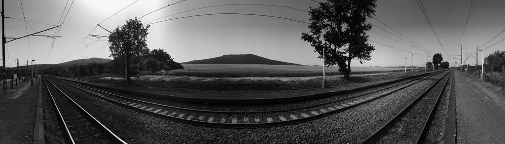 Keywords: railroad panorama railway landscape b w sky train panoramic outdoors nature black white wide-angle