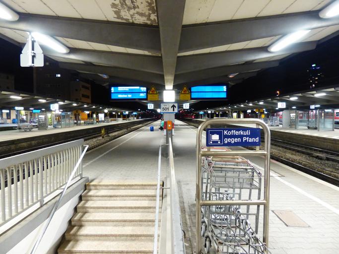 Keywords: railway station platform train railway breakpoint old traffic rail traffic railroad track track central station ad clock departure transport seemed luggage cart stairs