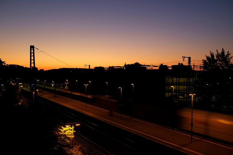 Keywords: railway station twilight evening sunset atmosphere abendstimmung reddish evening sky railway train silhouette transport sky glow track railroad track rail traffic platform seemed