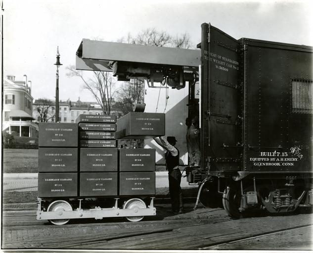 | Keywords: RailwayTestCar 003.jpg The design shown consists of eight 10 000 lb weights; four 2500 lb weights; 10 000 lbs of 50 lb weights and a truck used to carry the test load on the rails which is in itself 5 000 lbs as well as small auxiliary balances and weights giving this vehicle a total weight of over 105 000 lbs Small weights are furnished which run down to 1/10 000 of a pound Only decimal sub-divisions of a pound are used in this work Power for handling the weights is furnished by an electrical generator driven by a gasoline engine When in use teh car is set a short distance from the end of the scale the end doors of the car are opened and the overhead crane rails are advanced by means of a motor until they overhang the track by the required amount The truck is then connected to the crane and lifted from its position in the car and placed on the rails outside This is then followed by weights until the first test load is ready A cable is then connected to the truck and by means of a motor forming a part of the truck the truck and test load are moved from place to place on the car When the run is completed with this load other weights are added and the observations repeated on the higher loads for the different positions on the scale National Institute of Standards and Technology 1913-01-01 National Institute of Standards and Technology PD-USGov-NIST PD-USGov National Bureau of Standards National Institute of Standards and Technology Rail transport safety Crash tests rail |