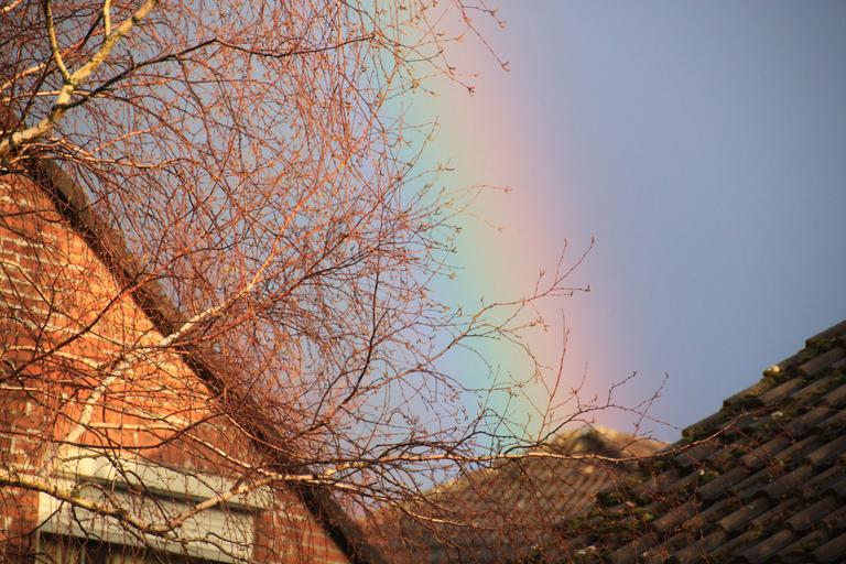 Keywords: rainbow bright contrasts spectrum weather natuschauspiel rainbow colors sunshine refraction colorful natural phenomenon weather phenomenon meteorology tree home branches roof roofs sky sky colors color