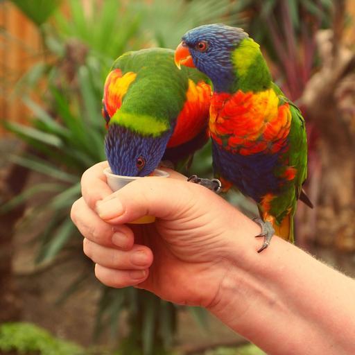 Keywords: rainbow lorikeet birds parrot coloured hand stick honey food