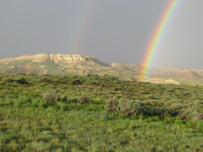 Keywords: rainbows two double scenic weather fossil butte national monument wyoming usa hills colorful blue yellow sky landscape
