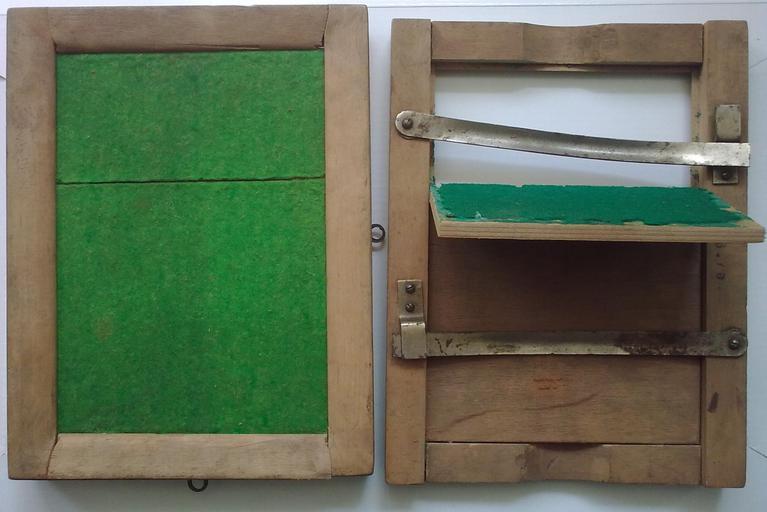 Keywords: Ramki-do-fotografii-stykowej.jpg en Wooden frames for contact prints on chloride paper; 30's of 20th century pl Ramki do naświetlania odbitek stykowych formatu dużej pocztówki - widok z przodu i z tyłu Wykorzystywane w latach 30 XX wieku Dzięki zamocowanej na zawiasach klapie z miękkim filcowym podłożem do ramki można było włożyć negatyw na szkle i chlorowy papier do odbitek stykowych a następnie po zamknięciu klapy i domknięciu metalowymi sprężynującymi dźwigniami uzyskiwano dokładny i trwały docisk emulsji papieru do emulsji negatywu Tak zamkniętą ramkę można było bezpiecznie wynieść z ciemni na światło bez ryzyka wzajemnego przemieszczenia papieru względem negatywu Po naświetleniu w tej technologii zazwyczaj co najmniej kilkuminutowym papieru chlorowego poprzez szklany negatyw całość ponownie przenoszono do ciemni gdzie papier poddawano procesowi chemicznego wywołania obrazu utajonego powstałego po naświetleniu a następnie utrwalenia tego obrazu own Julo 2010-04-23 Julo Photography accessories |
