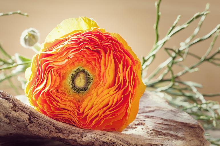 Keywords: ranunculus flower petals blossom bloom orange intense color gorgeous close bright