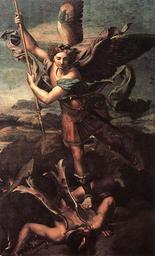 Keywords: Raphael - St. Michael Vanquishing Satan.jpg Artwork Creator Raffaello Sanzio en St Michael and the Devil circa 1504 1505 or 1518 Oil transferred from wood to canvas size cm 268 160 Institution Louvre 01 08 Denon 1 e étage Grande Galerie Collection de François Ier Département des Peintures object history credit line accession number WGA link 18866 http //www wga hu/art/r/raphael/5roma/5/03satan jpg http //www wga hu/html/r/raphael/5roma/5/03satan html painting religious Italian 1501-1550 PD-old-100 WGA form painting WGA type religious WGA School Italian WGA time period 1501-1550 Saint Michael Vanquishing Satan by Raffaello Sanzio |