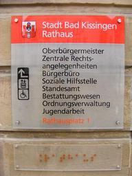 Keywords: Rathaus Bad Kissingen - Schild.JPG Neues Rathaus Bad Kissingen Schild own 2009-11-12 User Mattes FoP-Germany Rathaus Bad Kissingen Rectangular signs Signs in Bad Kissingen Braille signage Work by Mattes 2009 Taken with Fujifilm FinePix S5700 German language signs User Mattes/Contributions/Topics/Germany/Bad Kissingen User Mattes/Contributions/Topics/banners coat of arms flags logos seals and signs Town hall signs |