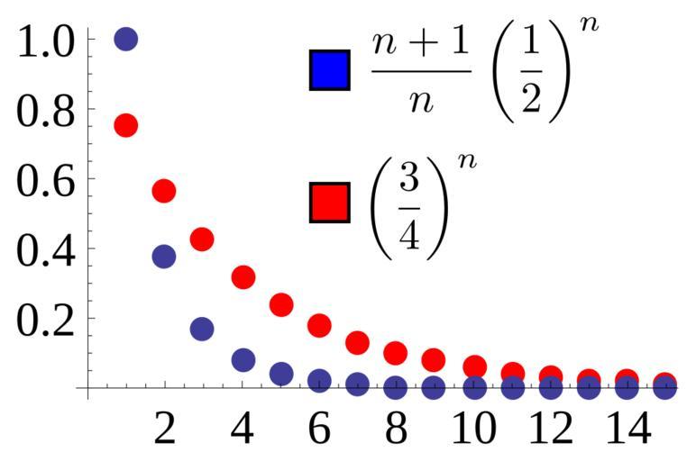 Keywords: Ratio test proof.svg ratio test test is proven in the convergent case Given a sequence like the blue one for which the ratio of adjacent terms <math> a_ n+1 /a_n </math> converges to L < 1 we identify a ratio r L+1 /2 and show that for large enough n the sequence is dominated by the simple geometric sequence r<sup>k</sup> In this case the ratio of adjacent terms of the blue sequence converges to L 1/2 so we choose r 3/4 and r<sup>k</sup> dominates for all n ‰¥ 2 Source used to generate this chart is shown below own User Dcoetzee 2013-03-24 Cc-zero Source All source released under CC0 waiver Mathematica source to generate graph which was then saved as SVG from Mathematica <pre> Show 3/4 n n 1 15 PlotStyle -> Hue0 PointSizeLarge ListPlot n + 1 /n 1/2 n n 1 15 PlotStyle -> PointSizeLarge PlotRange -> All AxesStyle -> FontSize -> 14 </pre> LaTeX source for labels <pre> \left \frac 3 4 \right n \frac n+1 n \left \frac 1 2 \right n </pre> These were converted to SVG with http //www tlhiv org/ltxpreview/ and then the graph was embedded into the resulting document in Inkscape Axis fonts were also converted to Liberation Serif and the legend was added in Inkscape Sequence mathematics Convergence |