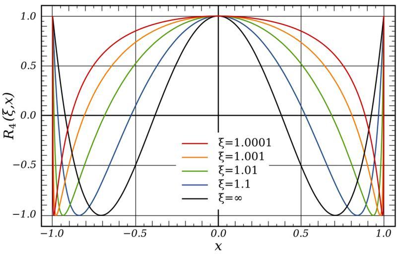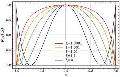 Keywords: Rational Elliptic Functions (xi varied, x=(-1,1)).svg rational elliptic function R<sub>4</sub> x on the interval ˆ’1 1 is the selectivity factor and is varied in this graph own Inductiveload 2009-01-29 Mathematica Code <pre><nowiki> xp2xi_ Module g num den g Sqrt4 xi 2 + 4 xi 2 xi 2 - 1 2/3 ; num 2 xi 2 Sqrtg; den Sqrt8 xi 2 xi 2 + 1 + 12 g xi 2 - g 3 - Sqrtg 3; num/den ; xz2xi_ xi 2/xp2xi; txi_ Sqrt1 - 1/xi 2; r1xi_ x_ x; r2xi_ x_ txi + 1 x 2 - 1 / txi - 1 x 2 + 1 ; r3xi_ x_ x 1 - xp2xi x 2 - xz2xi / 1 - xz2xi x 2 - xp2xi ; r4xi_ x_ Module num den num 1 + txi 1 + Sqrttxi 2 x 4 - 2 1 + txi 1 + Sqrttxi x 2 + 1; den 1 + txi 1 - Sqrttxi 2 x 4 - 2 1 + txi 1 - Sqrttxi x 2 + 1; num/den ; Plot Table r4xi x xi 1 0001 1 001 1 01 1 1 Infinity x -1 1 Axes -> False </nowiki></pre> Special functions XY plots Rational functions |