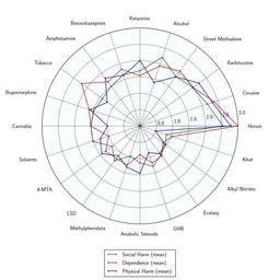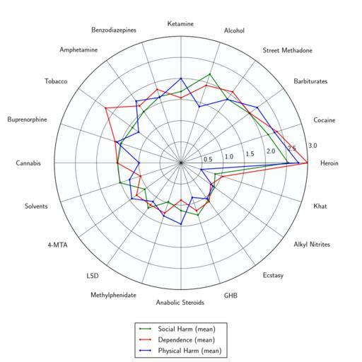 Keywords: Rational harm assessment of drugs radar plot.svg image It contains not only the physical harm and dependence data like the aforementioned image but also the mean social harm of each drug This image was produced with the python plotting library matplotlib This image is a reproduction of this image 2012-01-10 own Pmillerrhodes Uploaded with UploadWizard Pharmacology Recreational drug use Psychoactive drugs harm diagrams and charts |