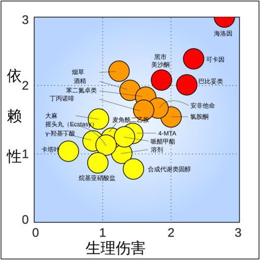 | Keywords: Rational scale to assess the harm of drugs (mean physical harm and mean dependence) zh.svg zh 药品危害量表(意为对身体的伤害和 赖 ) own <br/> Based on Flie Rational scale to assess the harm of drugs mean physical harm and mean dependence svg Skirtick 2015-08-09 Rational scale to assess the harm of drugs mean physical harm and mean dependence de svg Other versions/Rational scale to assess the harm of drugs mean physical harm and mean dependence 数据 prettytable sortable colspan 4 Physical harm colspan 4 Dependence colspan 4 Social harm - Drug Mean Physical harm<ref>NA Not Applicable is treated as zero</ref> Acute harm Chronic harm Intravenous harm Mean Dependence Pleasure Psychological Physical Mean Social harm Intoxication Social harm Health-care costs - Heroin 2 78 2 8 2 5 3 0 3 00 3 0 3 0 3 0 2 54 1 6 3 0 3 0 - Cocaine 2 33 2 0 2 0 3 0 2 39 3 0 2 8 1 3 2 17 1 8 2 5 2 3 - Barbiturates 2 23 2 3 1 9 2 5 2 01 2 0 2 2 1 8 2 00 2 4 1 9 1 7 - Tobacco 1 24 0 9 2 9 NA 2 21 2 3 2 6 1 8 1 42 0 8 1 1 2 4 - Alcohol 1 40 1 9 2 4 NA 1 93 2 3 1 9 1 6 2 21 2 2 2 4 2 1 - Street methadone 1 86 2 5 1 7 1 4 2 08 1 8 2 3 2 3 1 87 1 6 1 9 2 0 - Ketamine 2 00 2 1 1 7 2 1 1 54 1 9 1 7 1 0 1 69 2 0 1 5 1 5 - Amphetamine 1 81 1 3 1 8 2 4 1 67 2 0 1 9 1 1 1 50 1 4 1 5 1 6 - Benzodiazepines 1 63 1 5 1 7 1 8 1 83 1 7 2 1 1 8 1 65 2 0 1 5 1 5 - 4-MTA 1 44 2 2 2 1 NA 1 30 1 0 1 7 0 8 1 06 1 2 1 0 1 0 - Buprenorphine 1 60 1 2 1 3 2 3 1 64 2 0 1 5 1 5 1 49 1 6 1 5 1 4 - Cannabis 0 99 0 9 2 1 NA 1 51 1 9 1 7 0 8 1 50 1 7 1 3 1 5 - Solvents 1 28 2 1 1 7 NA 1 01 1 7 1 2 0 1 1 52 1 9 1 5 1 2 - Ecstasy 1 05 1 6 1 6 NA 1 13 1 5 1 2 0 7 1 09 1 2 1 0 1 1 - Methylphenidate 1 32 1 2 1 3 1 6 1 25 1 4 1 3 1 0 0 97 1 1 0 8 1 1 - GHB 0 86 1 4 1 2 NA 1 19 1 4 1 1 1 1 1 30 1 4 1 3 1 2 - LSD 1 13 1 7 1 4 0 3 1 23 2 2 1 1 0 3 1 32 1 6 1 3 1 1 - Anabolic steroids 1 45 0 8 2 0 1 7 0 88 1 1 0 8 0 8 1 13 1 3 0 8 1 3 - Khat 0 50 0 3 1 2 NA 1 04 1 6 1 2 0 3 0 85 0 7 1 1 0 8 - Alkyl nitrites 0 93 1 6 0 9 0 3 0 87 1 6 0 7 0 3 0 97 0 8 0 7 1 4 <references /> http //news bbc co uk/1/shared/bsp/hi/pdfs/31_07_06_drugsreport pdf Drug classification making a hash of it Appendix 14 http //www thelancet com/journals/lancet/article/PIIS0140673607604644/abstract The Lancet 2007; 369 1047-1053 ImageNote 1 313 25 28 14 380 380 2 Heroin ImageNoteEnd 1 ImageNote 2 268 71 28 28 380 380 2 Cocaine ImageNoteEnd 2 ImageNote 3 258 109 28 28 380 380 2 Barbiturates ImageNoteEnd 3 ImageNote 4 159 89 28 28 380 380 2 Tobacco ImageNoteEnd 4 ImageNote 5 175 117 28 28 380 380 2 Alcohol ImageNoteEnd 5 ImageNote 6 216 143 28 28 380 380 2 Amphetamine ImageNoteEnd 6 ImageNote 7 129 159 28 28 380 380 2 Cannabis ImageNoteEnd 7 ImageNote 8 85 206 28 28 380 380 2 Khat ImageNoteEnd 8 Nutt et al's drug harm chart SVG health |