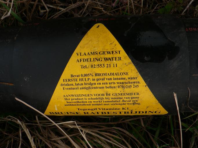 Keywords: Rattenvergifwaarschuwing.JPG rat poison on the Schelde river dike Steendorp Belgium 2007-02-17 own assumed Aliq text VLAAMS GEWEST AFDELING WATER Tel 02/553 21 11 Bevat 0 005 BROMADIALONE EERSTE HULP in geval van inname water drinken laten braken en een arts waarschuwen Eventueel antigifcentrum bellen 070/245 245 AANWIJZINGEN VOOR DE GENEESHEER Het product is schadelijk bij inname van grote hoeveelheden en werkt cumulatief Bevat een antibloedstollend middel met verlengde werking Tegengif Vitamine K1 BRUINE RATBESTRIJDING translation FLEMISH REGION DEPARTMENT WATER Tel 02/553 21 11 Contains 0 005 BROMADIALONE FIRST AID in case of ingestion drink water make vomit and warn a docter Call anti-poison center when necessary 070/245 245 DIRECTIONS FOR DOCTER The product is nocive when ingested in large quantities and works cumulative Contains an anticoagulant with prolonged activity Antidote Vitamin K1 BROWN RAT DESTRUCTION derivative works Rattenvergifwaarschuwing edit JPG Rat poisons Rodenticides |