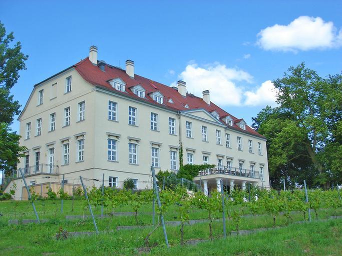 Keywords: Rattey Schloss Park Wein Fassade.JPG Schloss Rattey in Schönbeck nahe Neubrandenburg Landkreis Mecklenburgische Seenplatte Mecklenburg-Vorpommern Das klassizistische Schloss von 1806 ist berühmt für die Weingüter ringsum Geschichtl Abriss Im Jahr 1690 verlieh Gustav Adolf Herzog von Mecklenburg-Güstrow den Besitz an Georg-Henning von Oertzen Die Familie konnte den Besitz aber erst ab 1775 nach dem Erlöschen der Familie Manteuffel im männlichen Stamm für sich nutzen In diesem Jahr übernahm Victor-Wilhelm von Oertzen den Besitz Sein Sohn Hans-Christoph von Oertzen ließ 1806 das Herrenhaus einen zweigeschossigen Putzbau im klassizistischen Stil auf den Fundamenten eines älteren Gebäudes errichten Das Herrenhaus Rattey wurde zum Ende des 2 Weltkrieges durch die Familie von Oertzen an die Gemeinde verkauft Die Familie verließ Mecklenburg nach dem gescheiterten Hitler-Attentat an dem Hans-Ulrich von Oertzen maßgeblich beteiligt war Nach dem Krieg zogen vorerst Flüchtlinge in das Gebäude ein später wurden die Räume auch durch einen Kindergarten die Post und die LPG-Küche genutzt Im Jahr 1996 erwarben zwei Bremer Unternehmer das Herrenhaus und renovierten es von Grund auf Seit 1998 wird hier ein Hotel geführt Bekannt wurde Rattey auch als nördlichstes Weinanbaugebiet Deutschlands Im Park stehen 13 Eichen deren Alter auf mindestens 700 Jahre geschätzt wird gutshaeuser de own 2009-06-10 Horst-schlaemma Own work all rights released Public domain Schloss Rattey Files by User Horst-schlaemma |