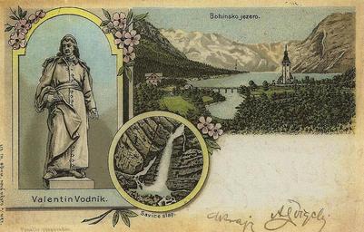 | Keywords: Razglednica Bohinjskega jezera 1898.jpg Razglednica Bohinjskega jezera 1898 http //www flickr com/photos/rimljancek/8256431021 author PD-Slovenia 1898 postcards of Slovenia Colored postcards of Slovenia Postcards of Lake Bohinj Historical images of Savica Falls Postcards of St John the Baptist's Church Ribčev Laz Historical images of Vodnik Monument |