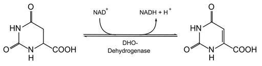 Keywords: Reaction of DHO to orotate.svg step 4 of pyrimidine de novo synthesis; oxidation of dehydroorotate to orotate by dehydroorotate dehydrogenase 4 Schritt der Pyrimidin-De-Novo-Synthese; Oxidation von Dehydroorotat zu Orotat durch Dehydroorotat-Dehydrogenase own 2008-06-16 --Ilgom talk Chemical reactions Orotic acid |