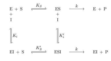 Keywords: Reaction scheme enzyme inhibition 2.svg Reaktionsschema einer Enzymhemmung mit Gleichgewichtskonstanten Reaction scheme of an enzyme inhibition with equilibrium constants LangSwitch E enzyme<br /> S substrate<br /> P product<br /> I inhibitor<br /> ES enzym substrat complex<br /> EI enzym inhibitor complex<br /> ESI enzym substrat inhibitor complex<br /> E Enzyme<br /> S Substrate<br /> P Produkt<br /> I Inhibitor<br /> ES Enzym-Substrat-Komplex<br /> EI Enzym-Inhibitor-Komplex<br /> ESI Enzym-Substrat-Inhibitor-Komplex<br /> Own 2010-09-12 Sponk <span class signature-talk >talk</span> Reaction scheme enzyme inhibition 1 svg<br /> Reaction scheme competitive enzyme inhibition svg<br /> Reaction scheme non-competitive enzyme inhibition svg<br /> Reaction scheme uncompetitive enzyme inhibition svg Enzyme kinetics Equilibrium constant |