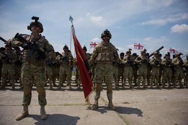 Keywords: noble partner noblepartner army u.s. army usarmy people outdoor VAZIANI TRAINING AREA, Georgia - Georgian soldiers stand ready for the opening ceremony for Exercise Noble Partner 16, May 11, at Vaziani Training Area, Georgia. The ceremony included static displays of multinational soldiers and their equipment, airborne operations and speeches from senior officials, including Georgian President Giorgi Margvelashvili. The exercise is taking place May 11 to 26 and includes approximately 1300 participants from the U.S., Georgia and the U.K. The exercise is a reoccurring training event that is taking place at Vaziani Training Area, Georgia. Noble Partner 16 is a critical part of Georgia's training for its contribution of a light infantry company to the NATO Response Force (NRF) and enhances Georgian territorial self-defense capability. (Photo by Sgt. Daniel Cole, U.S. Army Europe Public Affairs) VAZIANI TRAINING AREA, Georgia - Georgian soldiers stand ready for the opening ceremony for Exercise Noble Partner 16, May 11, at Vaziani Training Area, Georgia. The ceremony included static displays of multinational soldiers and their equipment, airborne operations and speeches from senior officials, including Georgian President Giorgi Margvelashvili. The exercise is taking place May 11 to 26 and includes approximately 1300 participants from the U.S., Georgia and the U.K. The exercise is a reoccurring training event that is taking place at Vaziani Training Area, Georgia. Noble Partner 16 is a critical part of Georgia's training for its contribution of a light infantry company to the NATO Response Force (NRF) and enhances Georgian territorial self-defense capability. (Photo by Sgt. Daniel Cole, U.S. Army Europe Public Affairs) |