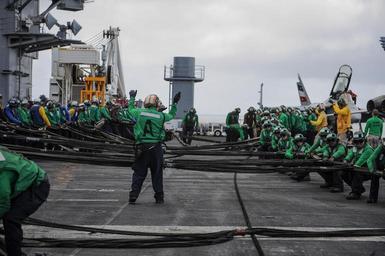 Keywords: Reagan flight deck barricade drill 140716-N-CW598-177.jpg en Aviation Boatswain's Mate Equipment 2nd Class Brittany Hearne a Colorado Springs Colo native gives the signal to raise the barricade during a drill on the flight deck of the aircraft carrier USS Ronald Reagan CVN 76 Ronald Reagan is participating in Rim of the Pacific RIMPAC Exercise 2014 Twenty-two nations more than 40 ships and six submarines more than 200 aircraft and 25 000 personnel are participating in RIMPAC exercise from June 26 to Aug 1 in and around the Hawaiian Islands The world's largest international maritime exercise RIMPAC provides a unique training opportunity that helps participants foster and sustain the cooperative relationships that are critical to ensuring the safety of sea lanes and security on the world's oceans RIMPAC 2014 is the 24th exercise in the series that began in 1971 U S Navy photo by Mass Communication Specialist 2nd Class Chelsea Kennedy/Released 2014-07-16 Petty Officer 2nd Class Chelsea Kennedy https //www dvidshub net/image/1451096 140716-N-CW598-177 2014-07-17 03 39 USS RONALD REAGAN AT SEA PD-USGov-Military-Navy Training on USS Ronald Reagan CVN-76 RIMPAC 2014 Images from DoD uploaded by Fæ |