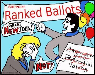 Keywords: ranked ballots rankedballots alternatve vote alternatvevote democracy preferential voting preferentialvoting text sign cartoon poster signboard outdoor illustration The Alternative Vote electoral system has not been a success; so it has been rebranded "Preferential Voting" and "Instant Runoff Voting" which is often referred to as "Ranked Ballots" ... whatever name you give to AV, it is always a Winner-Take-All electoral system. Public Domain To the extent possible under law, Laurel L. Russwurm has waived all copyright and related or neighboring rights to her public domain restorations and remixes. The Alternative Vote electoral system has not been a success; so it has been rebranded "Preferential Voting" and "Instant Runoff Voting" which is often referred to as "Ranked Ballots" ... whatever name you give to AV, it is always a Winner-Take-All electoral system. Public Domain To the extent possible under law, Laurel L. Russwurm has waived all copyright and related or neighboring rights to her public domain restorations and remixes. |