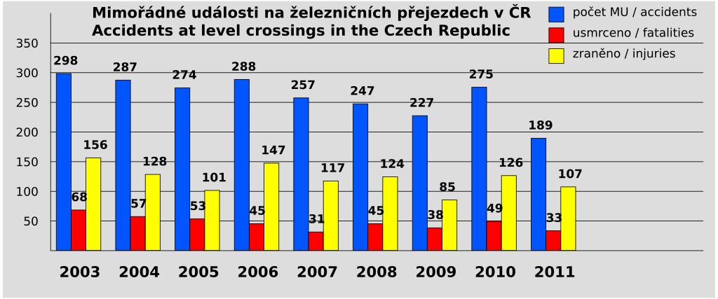 Keywords: Recent trends in level crossing accidents Czech Republic.svg Vývoj počtu a následků mimořádných událostí na železničních přejezdech v ČR za léta 2003 až 2011 Recent trends in accidents at railway level crossings in the Czech Republic HandSVG validSVG PD-CzechGov Rail transport accidents in the Czech Republic Road accidents in the Czech Republic Level crossings in the Czech Republic Czech_Republic in the 2000s |