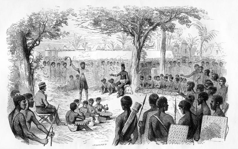 Keywords: Reception of the Mission by Shinté.jpg en Reception of the Mission by Shinté 17th Tuesday ”We were honoured with a grand reception by Shinte about eleven o ™clock The kotla or place of audience was about a hundred yards square and two graceful specimens of a species of banian stood near one end; under one of these sat Shinte on a sort of throne covered with a leopard ™s skin One of the trees being unoccupied I retreated to it for the sake of the shade We were now about forty yards from the chief and could see the whole ceremony The different sections of the tribe came forward in the same way that we did the head man of each making obeisance with ashes which he carried with him for the purpose; then came the soldiers all armed to the teeth running and shouting towards us with their swords drawn and their faces screwed up so as to appear as savage as possible for the purpose When all had come and were seated then began the curious capering usually seen in pichos A man starts up and imitates the most approved attitudes observed in actual fight This over Sambanza and the spokesman of Nyamoana stalked backwards and forwards in front of Shinte and gave forth in a loud voice all they had been able to learn either from myself or other people the wish to open the country to trade; the Bible as a word from heaven; the white man ™s desire for the tribes to live in peace Behind Shinte sat about a hundred women clothed in their best which happened to be a profusion of red baize A party of musicians consisting of three drummers and four performers on the piano marimba went round the kotla several times regaling us with their music The drums are neatly carved from the trunk of a tree When nine speakers had concluded their orations Shinte stood up and so did all the people He had maintained true African dignity all the while but my people remarked that he scarcely ever took his eyes off me for a moment pp 291-94 1857 http //libweb5 princeton edu/visual_materials/maps/websites/africa/livingstone/livingstone-images html David Livingstone Missionary Travels and Researches in South Africa Including a Sketch of Sixteen Years ™ Residence in the Interior of Africa and a Journey from the Cape of Good Hope to Loanda on the West Coast Thence Across the Continent Down the River Zambesi to the Eastern Ocean London John Murray 1857 David Livingstone other versions PD-Art Uploaded with UploadWizard Christian mission in art David Livingstone |