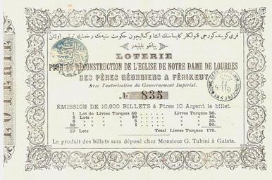 Keywords: Reconstruction of the Georgian Catholic Notre Dame de Lourdes Church.jpg en A lottery ticket managed by Mr G Tubini of Galata for the reconstruction of the Georgian Catholic Notre Dame de Lourdes Church in Bomonti Şişli - one of the few still standing in the world http //www levantineheritage com/tubini htm Author 1861 Notre Dame de Lourdes Istanbul Documents of the Ottoman Empire Documents in French Bilingual documents PD-Ottoman