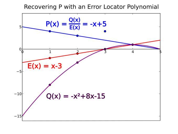 Keywords: Recovering P(x) with an Error Locator Polynomial.svg Uploaded with en wp UW marker 2012 10 14 Recovering data redundantly encoded into a polynomial using the Berlekamp-Welch method The error locator polynomial serves to neutralize errors in P by making Q zero at those points so that the system of linear equations is not affected by that inaccuracy in the input Drawn with Matplotlib and Inkscape 2012-10-14 Vbuterin cc-zero White background |