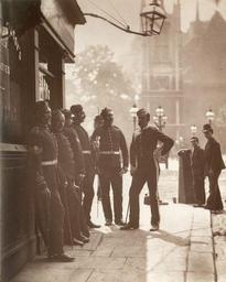 Keywords: Recruiting Sergeants.jpg http //archives lse ac uk/Record aspx src CalmView Catalog id SR+1146 archives lse ac uk/Record aspx src CalmView Catalog i <br/>Street Life in London published in 1876-7 consists of a series of articles by the radical journalist Adolphe Smith and the photographer John Thomson The pieces are short but full of detail based on interviews with a range of men and women who eked out a precarious and marginal existence working on the streets of London including flower-sellers chimney-sweeps shoe-blacks chair-caners musicians dustmen and locksmiths The subject matter of Street Life was not new “ the second half of the 19th century saw an increasing interest in urban poverty and social conditions “ but the unique selling point of Street Life was a series of photographs ˜taken from life ™ by Thomson The authors felt at the time that the images lent authenticity to the text and their book is now regarded as a key work in the history of documentary photography http //www flickr com/photos/lselibrary/5634667160/ Recruiting Sergeants Uploaded by Fæ 2011-04-02 16 38 John Thomson 1837-1921 PD-Old-80 Flickr-no known copyright restrictions File Upload Bot Magnus Manske May 28 2011 Street Life in London 1877 Sepia photographs of London 1877 Dragoons Adolphe Smith Military life Photos uploaded from Flickr by Fæ using a script Military history of London