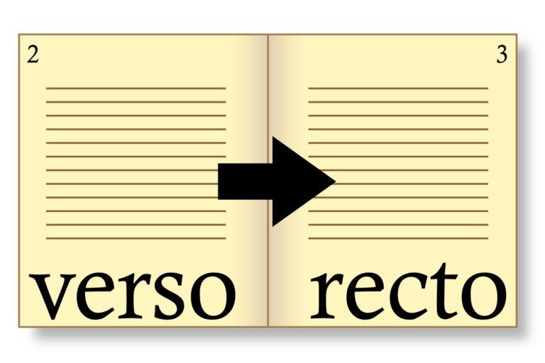 Keywords: Recto and verso.svg Illustration of recto and verso own 2008-04-08 Tkgd2007 Page layout Pagination Examples of typography terms Reverses SVG typography