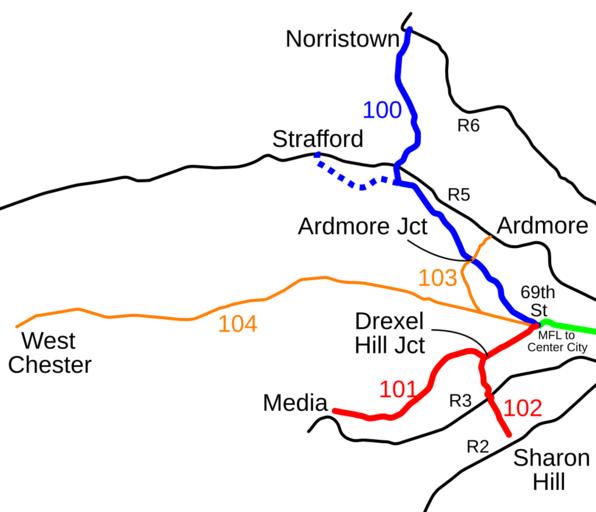 Keywords: Red Arrow map.svg Map of the former Red Arrow trolley lines some of which are now run by SEPTA Blue 100 is the Norristown High Speed Line red 101 and 102 is the Media and Sharon Hill lines and orange 103 and 104 is former trolley lines now bus Regional Rail is in black own 2005 User SPUI spuimap Public transport maps of Philadelphia Rail transport maps of Pennsylvania SEPTA maps Philadelphia Suburban Transportation Company |