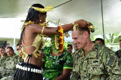 | Keywords: Red Beach Primary School ribbon cutting 150617-N-HY254-028.jpg en TARAWA Kiribati June 17 2015 - An I-Kiribati girl presents a traditional garland to Commodore Task Force Forager Capt James Meyer during a ribbon cutting ceremony June 17 The ribbon cutting marks the completion of renovations by Seabees attached to Pacific Partnership 2015 Task Force Forager is embarked aboard the Military Sealift Command joint high speed vessel USNS Millinocket JHSV 3 Millinocket is serving as the secondary platform for Pacific Partnership led by an expeditionary command element from the Navy ™s 30th Naval Construction Regiment 30 NCR from Port Hueneme Calif Now in its 10th iteration Pacific Partnership is the largest annual multilateral humanitarian assistance and disaster relief preparedness mission conducted in the Indo-Asia Pacific region While training for crisis conditions Pacific Partnership missions have provided medical care to approximately 270 000 patients and veterinary service to more than 38 000 animals Additionally Pacific Partnership has provided critical infrastructure development to host nations through the completion of more than 180 engineering products U S Navy photo by Chief Mass Communication Specialist Jonathan Kulp/Released 2015-06-17 Chief Petty Officer Jonathan Kulp https //www dvidshub net/image/2007130 150617-N-HY254-028 2015-06-17 06 06 TARAWA KI PD-USGov-Military-Navy Pacific Partnership 2015 Images from DoD uploaded by Fæ |