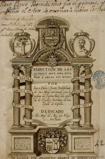| Keywords: Reduction de las letras Bonet 1620.jpg es Reduction de las letras y arte para enseñar a ablar los mudos Texto impreso / por Iuan Pablo Bonet - En Madrid por Francisco Abarca de Angulo 1620 - 26 308 6 p 8 h de grab 1 h de grab pleg ; 4º Signatura R/22745 1620 http //bdh bne es/bnesearch/detalle/bdh0000047536 - Biblioteca Digital Hispánica Biblioteca Nacional de España Pablo Bonet Juan 1579-1633 other versions BNE PD-old-100 Uploaded with UploadWizard Spanish language | ||||