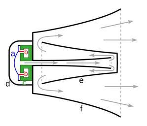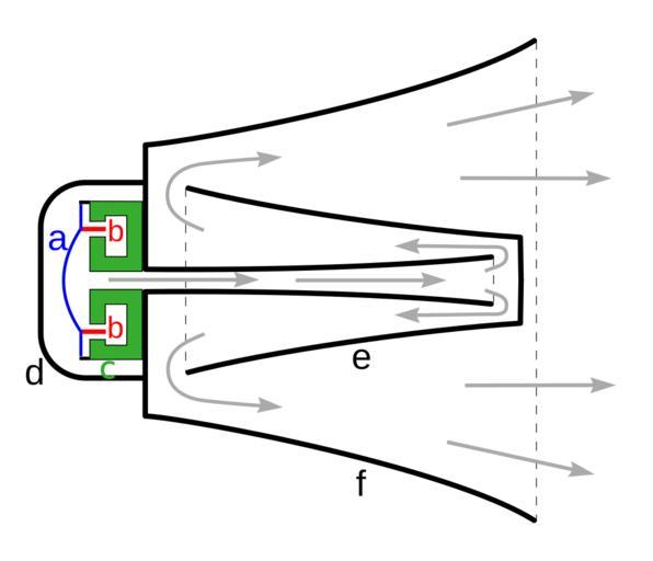 Keywords: Reflex horn loudspeaker drawing.svg horn loudspeaker works Shows a section through the axis of the speaker The reflex speaker also called a trumpet speaker megaphone bullhorn or loudhailer is widely used in public address systems The function of a horn in a speaker is to couple the diaphragm more efficiently to the air so more of the vibrational energy is radiated as sound Horn speakers can have ten times the efficiency of cone speakers so they are used in high power applications such as P A systems However horns that can reproduce the human voice adequately must be several feet long so to make the speaker more compact folded horns are often used in which the sound path is bent into a zigzag shape by reflections Developed in the 1940s a reflex speaker is a type of folded horn in which the sound path is a series of concentric ducts <br /> The sound is produced by a specialized diaphragm speaker called a compression driver d which is designed to work loaded by the high sound pressures in the horn This consists of a stiff metal diaphragm <font color blue > a </font> driven by a voice coil <font color red > b </font> mounted between the poles of a cylindrical magnet <font color green > c </font> The sound follows a zigzag path through a series of exponentially widening ducts through the central projection of the horn e and out through the concentric outer horn f 2012-07-10 own Chetvorno cc-zero Uploaded with UploadWizard Horn speakers Loudspeaker schematics |