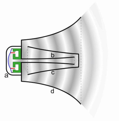 Keywords: Reflex loudspeaker animation 2.gif folded horn speaker widely used in public address systems It consists of a specialized diaphragm loudspeaker called a compression driver a attached to a metal or plastic horn d The driver has a small metal diaphragm <font color blue > blue </font> driven to vibrate by the audio signal current flowing through a coil of wire <font color red > red </font> between the poles of a cylindrical magnet <font color green > green </font> The horn serves to couple the diaphragm more efficiently to the air allowing it to radiate more of its energy as sound than a conventional horn speaker making it louder The horn sound path must be several feet long so to make the speaker more compact the sound path is folded into a zigzag shape by several concentric exponentially-widening ducts The sound waves pass forward through an inner tube b in the central projection in the horn back through a larger concentric tube c then out through the surrounding horn d <br /><br /> Reentrant loudspeakers can be 10 times as efficient as cone loudspeakers and so their output can be 10 dB louder when operating from the same amplifier However their frequency response is very uneven and limited with a bandwidth of 300-400 Hz to 5 kHz so they have a distinctive tinny sound and are only used for the human voice <br /><br /> In this animation the rate of vibration of the diaphragm and the speed of the sound waves are shown greatly reduced 2013-03-02 17 45 33 own Chetvorno This is an improved version of my previous animation Reflex loudspeaker animation gif Improvements Made speaker horn closer to shape of actual bullhorn showed sound waves radiating from mouth Increased speed of animation to more realistically represent speaker vibrations Increased wavelength to more realistically represent actual sound waves in speaker; previous waves were in ultrasonic range cc-zero Uploaded with UploadWizard Horn speakers Public address speakers Loudspeaker schematics Animated diagrams |