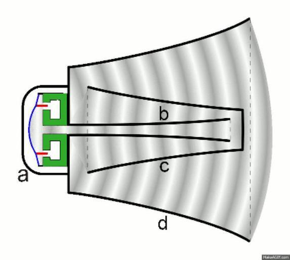 Keywords: Reflex loudspeaker animation.gif folded horn speaker widely used in public address systems It consists of a specialized diaphragm loudspeaker called a compression driver a attached to a metal horn d The driver has a diaphragm <font color blue > blue </font> driven to vibrate by the audio signal current flowing through a coil of wire <font color red > red </font> between the poles of a cylindrical magnet <font color green > green </font> The horn serves to couple the diaphragm more efficiently to the air allowing it to radiate more of its energy as sound than a conventional horn speaker making it louder The horn sound path must be several feet long so to make the speaker more compact the sound path is folded into a zigzag shape by several concentric exponentially-widening ducts The sound waves pass forward through an inner tube b in the central projection in the horn back through a larger concentric tube c then out through the surrounding horn d <br /><br /> In this animation the rate of vibration of the diaphragm and the speed of the sound waves are shown greatly reduced The logo in the lower right corner is not a part of the diagram and was added by the gif animation software 2012-07-16 own Chetvorno Reflex loudspeaker animation 2 gif is an improved more realistic version of this animation cc-zero Uploaded with UploadWizard Horn speakers Public address speakers Loudspeaker schematics Animated diagrams Animated GIF