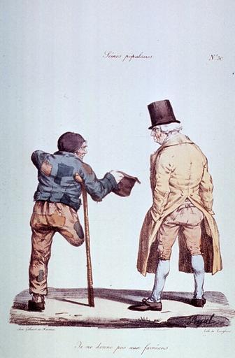 Keywords: Refusing a beggar with one leg and a crutch.jpg An amputee beggar holds out his hat to a well dressed man who is standing with his hands in his pockets Artist's caption's translation I don't give to idlers http //ihm nlm nih gov/luna/servlet/view/all/what/Amputees this webpage in the collection of http //ihm nlm nih gov/ Images from the History of Medicine which is a library of the U S government's http //nih gov National Institutes of Health Caricature by Edmé Jean Pigal 1798-1872 ; lithograph by Langlumé; published by Gihaut et Martinet PD-old-70 Joseph Langlumé Amputees in art Challenges to physical balance Crutches in art Patches Disabled beggars in art People with mobility impairment in art |