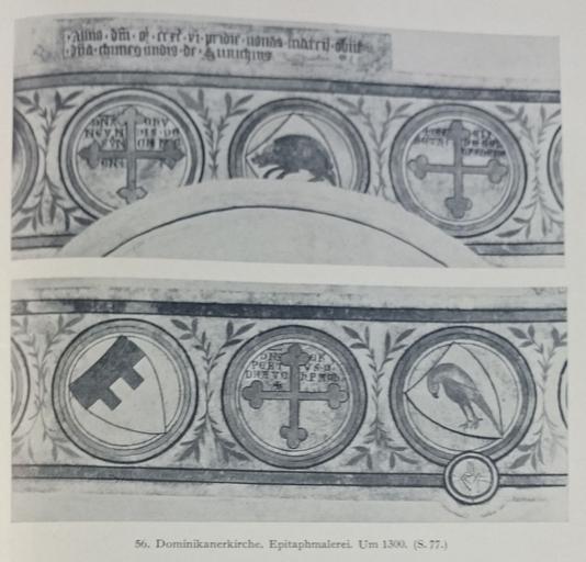 Keywords: Regensburg dominikanerkirche wappenfries.jpg Wappenfries in der Regensburger Dominikanerkirche Die Kunstdenkmäler der Oberpfalz 22 1933 S 77 century 14 author Anonymous-EU Dominikanerkirche St Blasius in Regensburg Coats of arms from Regensburg Coats of arms on frescos |