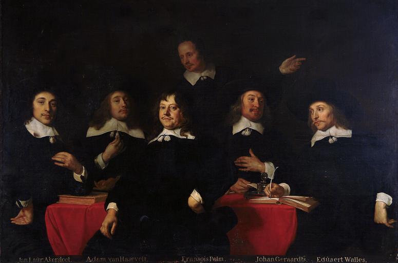 Keywords: Regenten van het Aalmoezeniers-, Arm- en Werkhuis te Haarlem door Jacob van Loo.jpg Artwork Creator Jacob van Loo LangSwitch Portrait of the regents of the Alms Poor and Work House in Haarlem <ref>http //fhm imagedatabase nl/imagebank/detail asp image_id 640 Frans Hals Museum imagedatabase </ref> Groepsportret van de regenten van het Aalmoezeniers- Arm- en Werkhuis te Haarlem <ref>http //www geheugenvannederland nl/ /nl/items/FHM01 OS-I-245 Geheugen van Nederland </ref> LangSwitch Pendant of Pendant van File Regentessen van het Aalmoezeniers- Arm- en Werkhuis te Haarlem jpg 1658 Oil on canvas cm 159 237 Frans Hals Museum http //fhm imagedatabase nl/imagebank/detail asp image_id 640 Frans Hals Museum imagedatabase<br /> 11979 <br /> 177741 object history Regentenkamer Aalmoezeniers- Arm- en Werkhuis Haarlem <br /> ProvenanceEvent 1862 conveyance LangSwitch the au het Frans Hals Museum Haarlem credit line Ian Laûr Akersloot - Adam van Hasevolt - Fransois Palm - Johan Geeraardts - Edûaert Walles bottom caption accession number OS I-245 www geheugenvannederland nl http //www geheugenvannederland nl/ /en/homepage Home http //www geheugenvannederland nl/ /en/items/FHM01 OS-I-245 Info PD-old-100 LangSwitch Notes Noten <references /> Dutch Golden Age portraits of guilds Jacob van Loo 1658 Paintings in the Frans Hals Museum Loo Jacob van Group portraits with 6 persons