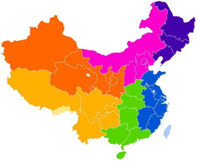 | Keywords: Regions of China.svg Číny od horního levého rohu proti směru hodinových ručiček tmavě oranžově severozápadní Čína světle oranžově jihozápadní Čína zeleně středojižní Čína modře východní Čína a světlemodře Čínská republika fialově severovýchodní Čína růžově severní Čína Quintucket 2011-12-25 Maps of regions of China Cc-zero |