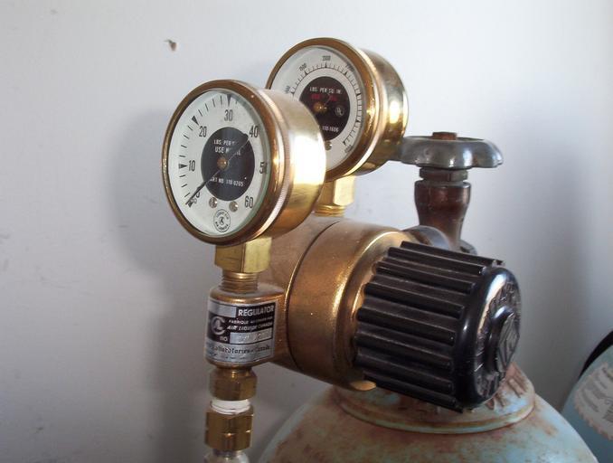 Keywords: Regulator valve & pressure gauge.JPG CambridgeBayWeather Close up of regulator valve and pressure guages as used to inflate ceiling balloons The closer of the gauges shows the helium flowing to the balloon The further gauge shows the amount of helium remaing in the tank Pressure regulators |