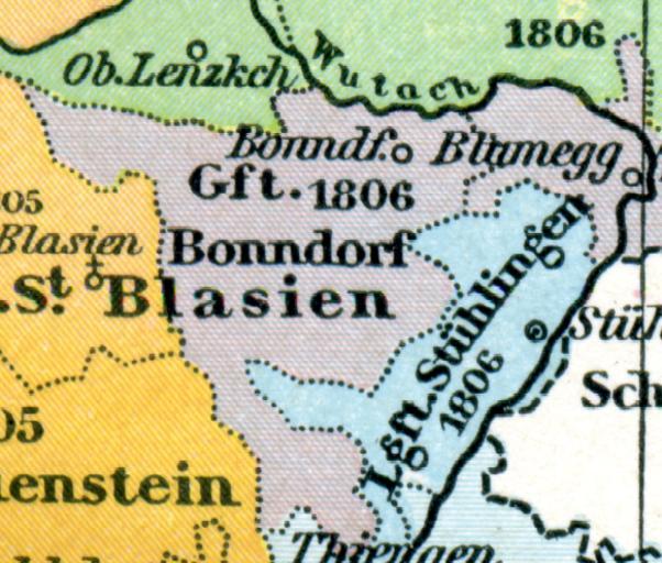 | Keywords: Reichsherrschaft Bonndorf 1806 V2.PNG  de Karte der Reichsherrschaft Bonndorf um 1806 F W Putzgers Historischer Schul-Atlas Bielefeld und Leipzig 1914 S 34 Baden zieglhar via Scann aus dem Atlas 1914 PD-old Old maps of Baden-Württemberg Kloster St Blasien |