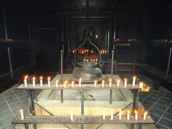 Keywords: Reikado Hall - DSC02078.JPG Reikado Hall atop Mount Misen on Miyajima Hatsukaichi Hiroshima Japan Said to be spot where Kūkai 空海 known posthumously as Kōbō-Daishi 弘法大師 the founder of Shingon Buddhism performed ascetic practices in the year 806 AD The fire within this building is claimed to have burned without stop since that time I took this photograph 2011-12-10 00 19 23 Daderot Public domain Reikado Hall |
