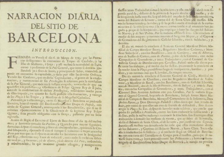 | Keywords: Relación diaria del sitio de Barcelona 17 julio 1714.jpg es Relación diaria del sitio de Barcelona capital del Principado de Cataluña 2013-03-06 05 39 41 Biblioteca de Catalunya F Bon 9011 Gabriel Bro impresor Girona 1714 Books in Spanish Books about Barcelona Books from Catalonia 1714 books Biblioteca de Catalunya Siege of Barcelona 1713-1714 Catalonian army Books about the Mediterranean PD-old | ||||