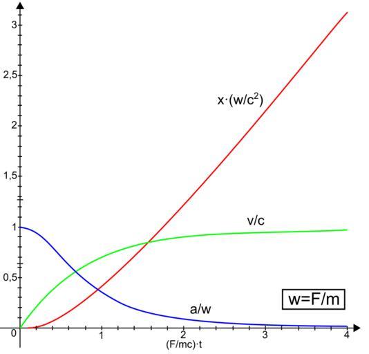 Keywords: Relativistic-UAM.svg en Relativistic motion under constant force F with zero initial velocity acceleration blue velocity green displacement red Assymptotically the motion is uniform velocity motion with v c Relativistic-UAM png 2011-10-04 16 42 UTC Relativistic-UAM png Davius derivative work Robot8A <span class signature-talk >talk</span> SVG Robot8A Relativistic-UAM png own Davius 2010/May Kinematics</nowiki> Uploaded with derivativeFX Kinematics Special relativity |