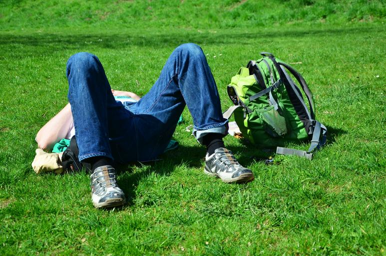 Keywords: relax rest break meadow green relaxation concerns grass sleep doze recovery shoes backpack nature human man