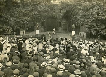 Keywords: the women's library thewomenslibrary women suffrage politics hires monochrome 7JCC/O/02/040 Photograph, printed, paper, monochrome, view from above of a crowd at the gates of Holloway Prison, two women running from the prison doors, stuck on paper with manuscript caption 'Release of Mrs Leigh and Miss New - Holloway 22 Aug 1908 - arrest 30 Jun for breaking Mr Asquith's windows' 7JCC/O/02/040 Photograph, printed, paper, monochrome, view from above of a crowd at the gates of Holloway Prison, two women running from the prison doors, stuck on paper with manuscript caption 'Release of Mrs Leigh and Miss New - Holloway 22 Aug 1908 - arrest 30 Jun for breaking Mr Asquith's windows' |