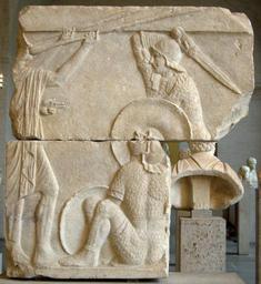 Keywords: Relief gladiators Glyptothek Munich 364.jpg Reliefplatten mit Darstellung eines Gladiatorkampfes wohl Teil eines Grabmonument 1 Jahrhundert v Chr Zwei Tubabläser verkünden den Sieg im Zweikampf Der Sieger ist zum Schlag bereit und wartet auf das Urteil der Zuschauer die über Leben und Tod des Besiegten entscheiden Relief with a scene of gladiator fight perhaps part of a funerary monument 1st century BC Two trumpet players proclaim the victory of the duel The winner raises his sword and awaits the verdict of the spectators who decide life or death for the loser Relief avec une scène de combat de gladiateur provenant peut-être d'un monument funéraire Ier siècle av J -C Deux joueurs de trompettes proclament la victoire du duel Le vainqueur a l'épée levée et attend le verdict des spectateurs qui doit décider de la vie ou de la mort du vaincu H 107 5 cm Museum Glyptothek Munich Room 11 Saal der römischen Bildnisse object history credit line Purchased in Rome in 1899 from Bissing Collection accession number Inv 364 User Bibi Saint-Pol own work 2007-02-08 other versions Ancient musical instruments Reliefs of gladiators Ancient Roman reliefs in the Glyptothek Munich Glyptothek Munich - Room 11 Bissing Collection 1st-century BC reliefs Ancient Roman reliefs from Italy |