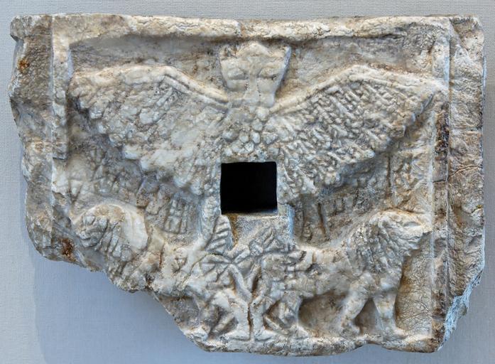 | Keywords: Relief Im-dugud Louvre AO2783.jpg Votive relief of Ur-Nanshe king of Lagash representing the bird-god Anzu or Im-dugud as a lion-headed eagle Alabaster Early Dynastic III 2550 “2500 BC Found in Telloh ancient city of Girsu Relief votif d'Ur-Nanshe roi de Lagash représentant l'oiseau-tempête divin Anzû ou Im-dugud en aigle léontocéphale Albâtre Dynasties Archaïques III 2550-2500 av J -C Découvert à Tello ancienne cité de Girsu H 21 6 cm 8 ½ in W 15 1 cm 5 ¾ in D 3 5 cm 1 ¼ in Museum Louvre Department of Oriental Antiquities Richelieu lower ground floor room 1a case 5 object history credit line Purchase accession number AO 2783 Marie-Lan Nguyen 2005 other versions Anzu Ur-Nanshe Girsu Art of Sumer Early Dynastic III Sculptures of Mesopotamian mythology Reliefs of Ancient Near East Art made from alabaster Animals in art of the ancient Near East Confronted-animals Lions in art of the ancient Near East Near Eastern Antiquities in the Louvre - Room 1a |